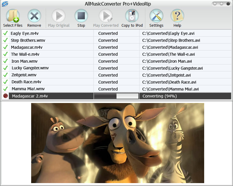 AllMusicConverter also can convert any video files to MP4 (iPod format), WMV (Windows computer format) or AVI (DVD player format).